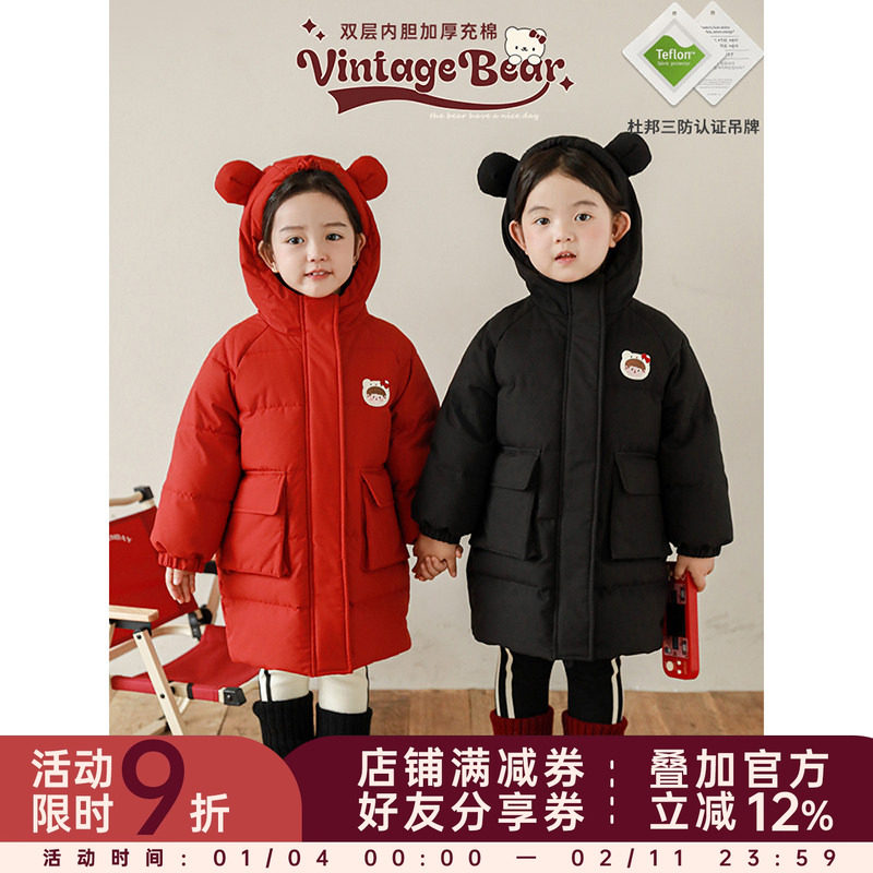 幼悠女童杜邦三防安安贴布绣标长款保暖棉服冬季小熊耳朵连帽外套