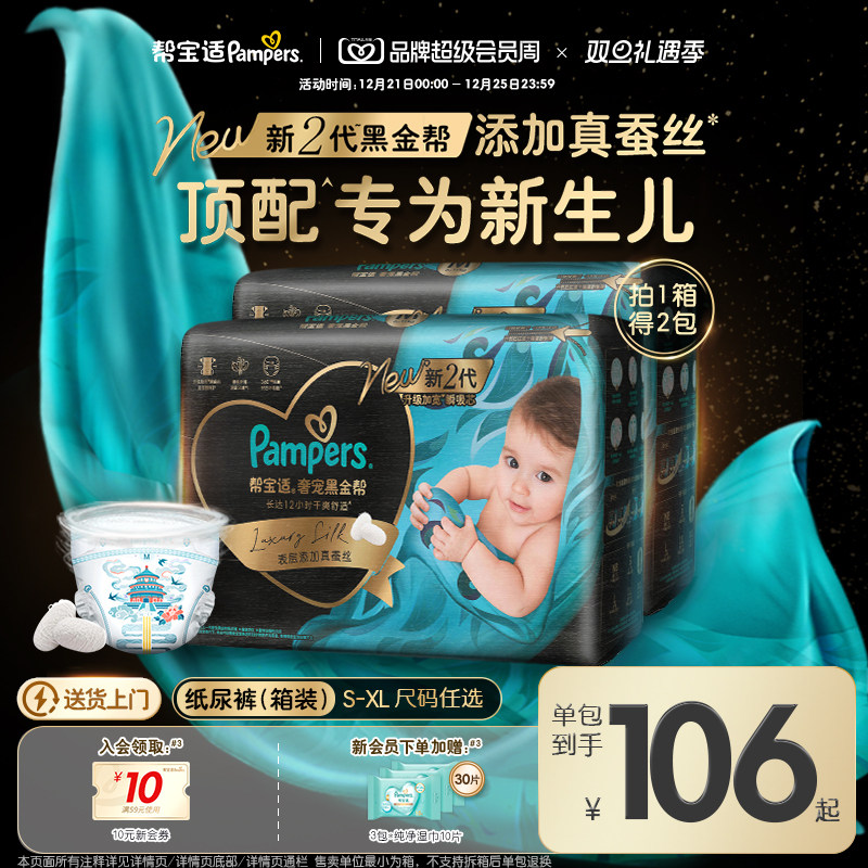【新生儿顶配】新帮宝适黑金帮纸尿裤添加真蚕丝S-XL尿不湿箱装