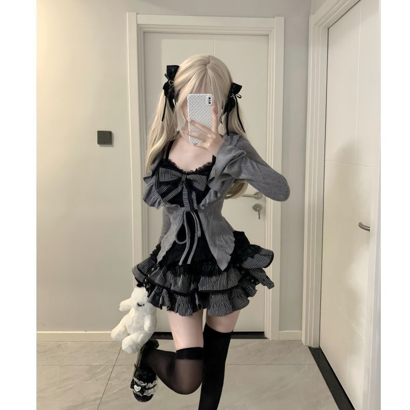 学院风jk制服套装女秋季黑色蕾丝吊带灰色针织开衫蛋糕裙三件套裙