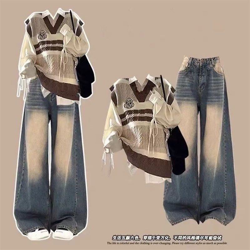 15少女春季衬衫马甲13岁一套衣服12初中学生14-17少女牛仔裤套装