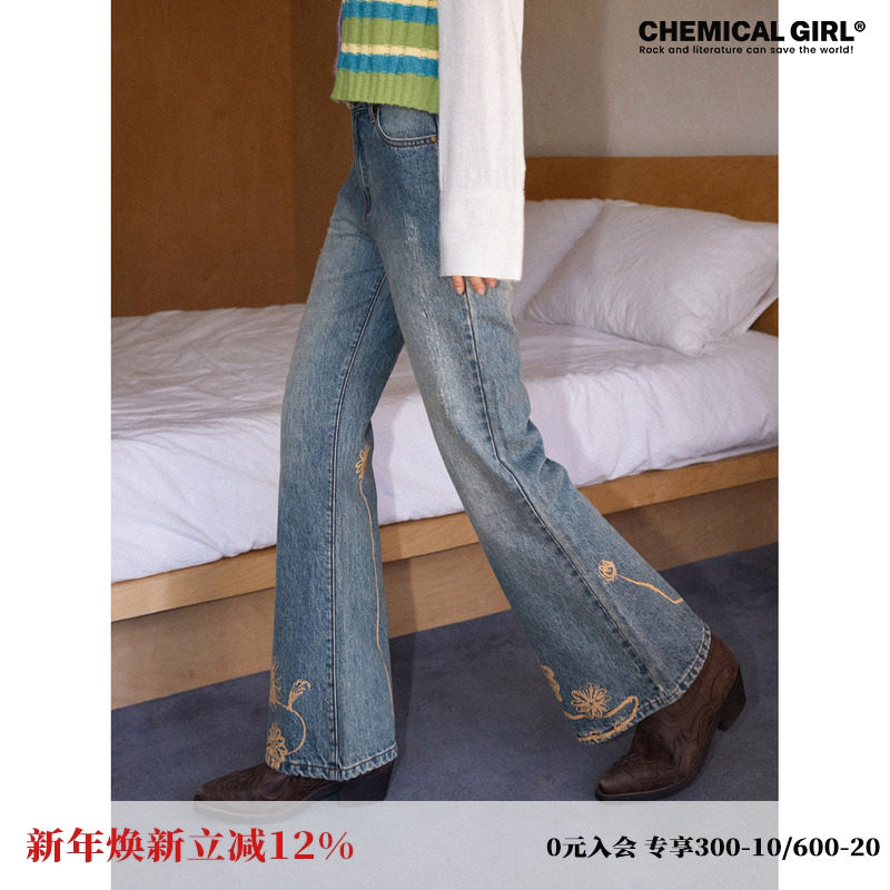 化学少女 X3 「燎原生花」烧花印花弯刀牛仔裤复古做旧梨形遮胯裤