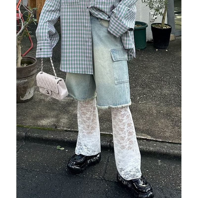 KEIKO 鬼马少女感提花拼接背带牛仔裤25早秋减龄显瘦宽松阔腿短裤