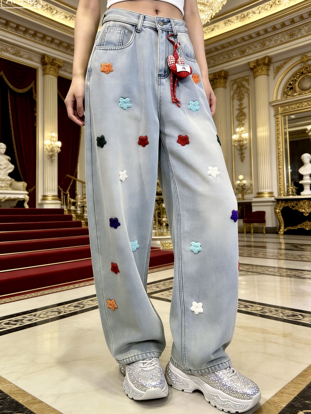 大码少女风设计感小熊贴绣牛仔裤女2025春季新款宽松显瘦阔腿长裤