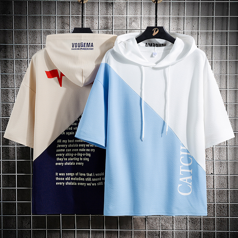 春夏季潮流宽松短袖男ins撞色连帽学生T恤潮牌韩版五分半袖男上衣