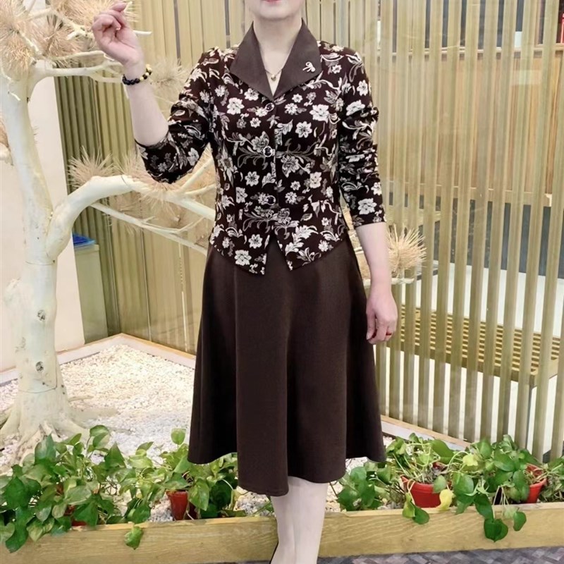 中年妈妈夏装连衣裙洋气新款中老年女春秋气质假两件长袖雪纺裙子