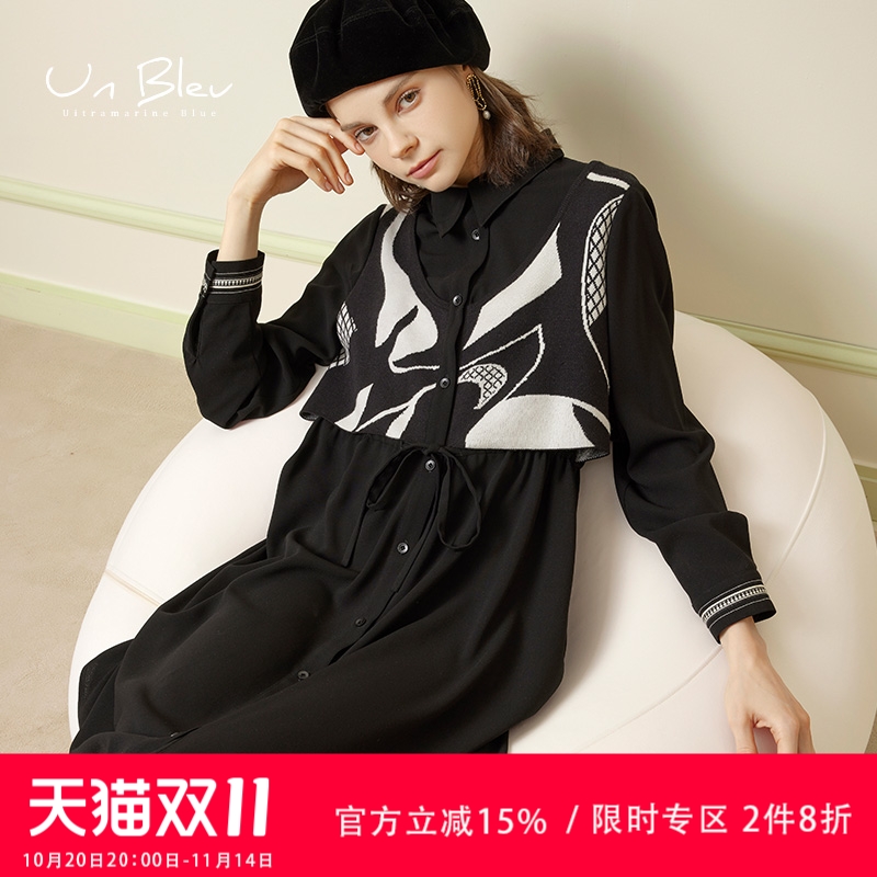 UnBleu假两件连衣裙女春秋季新款气质非正式马甲雪纺长袖黑色裙子