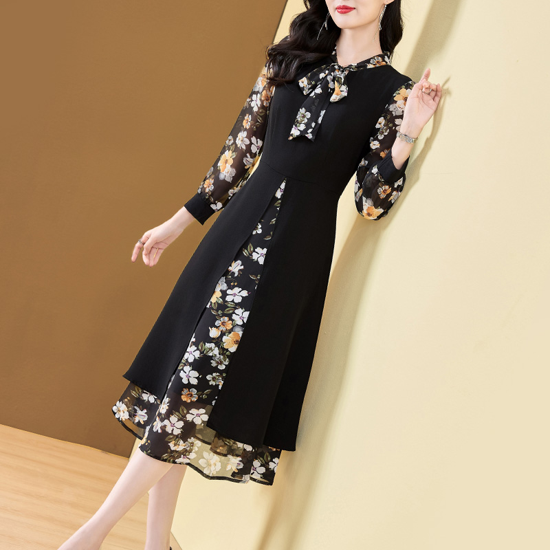 小个子洋气减龄假两件雪纺碎花拼接连衣裙女春季中年妈妈a字裙子