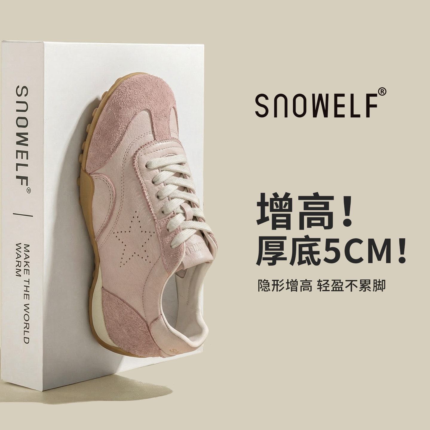 杏色厚底星星板鞋女2026新款春季真皮舒适百搭内增高运动休闲鞋子