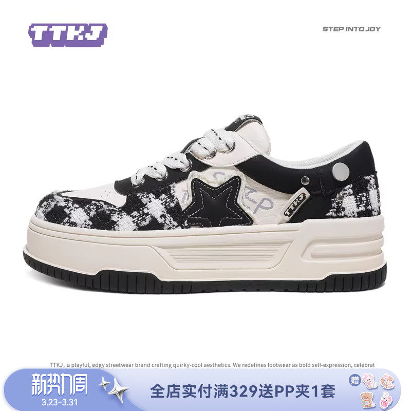 TTKJ星星板鞋女2026新款粗花呢黑白拼色厚底增高跑步休闲运动鞋子