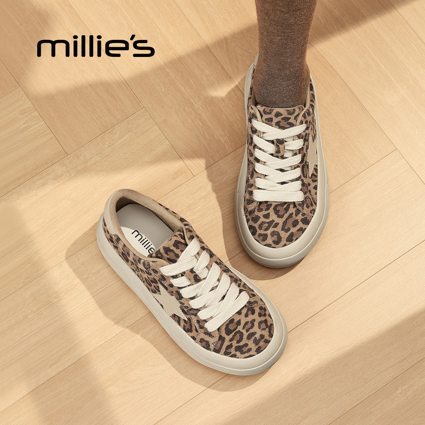 MILLIE'S/妙丽系带深口单鞋女款豹纹星星鞋子时尚休闲鞋厚底板鞋