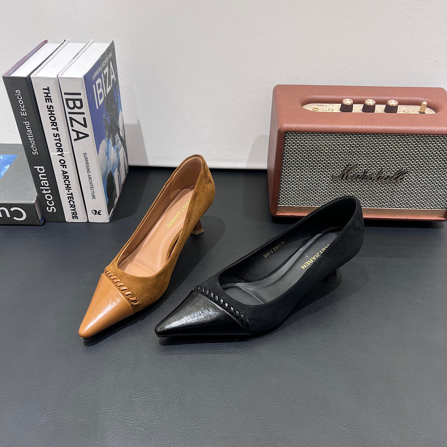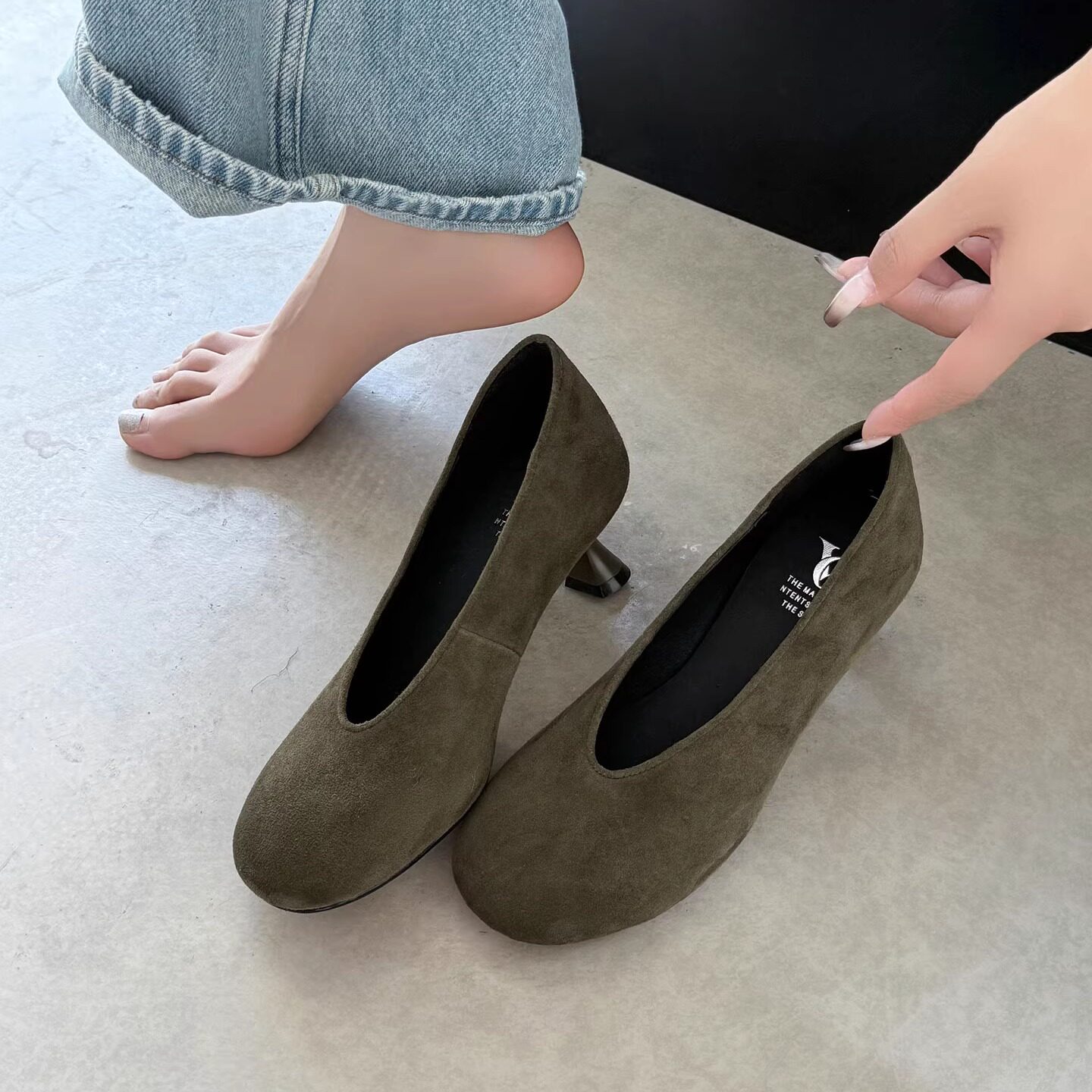 德芙琳鹿皮磨砂反绒高跟鞋法式尖头浅口单鞋2025新款6cm细跟鞋