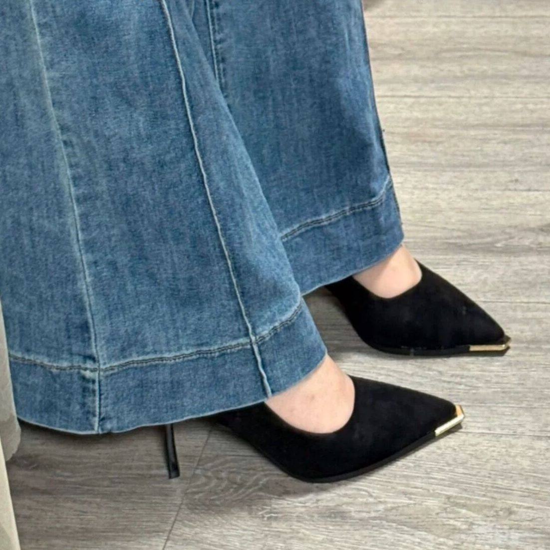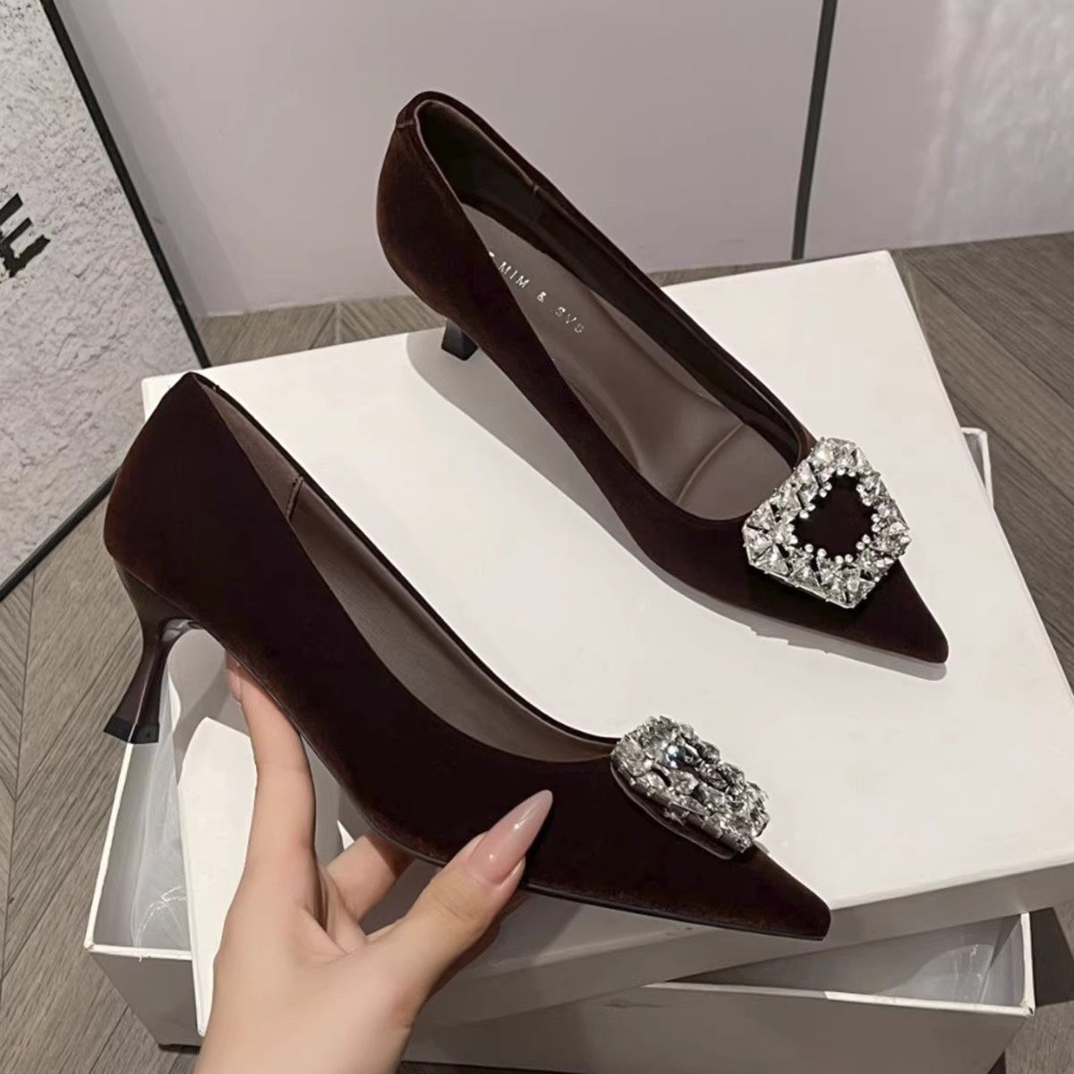 时尚水钻方扣气质尖头高跟鞋女细跟2025新款黑色磨砂羊皮浅口单鞋