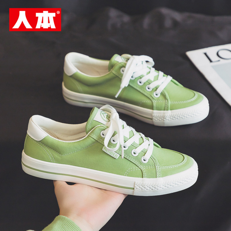 人本2026新款绿色帆布鞋女板鞋百搭软底鞋女鞋休闲平底学生球鞋子