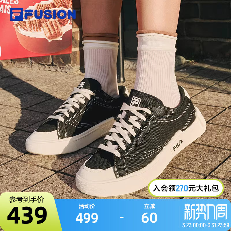 FILA FUSION斐乐潮牌帆布鞋女鞋休闲滑板鞋透气平底黑色低帮鞋子