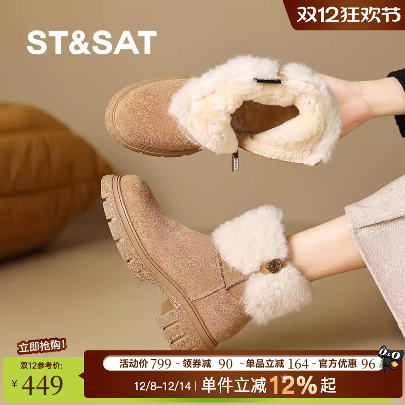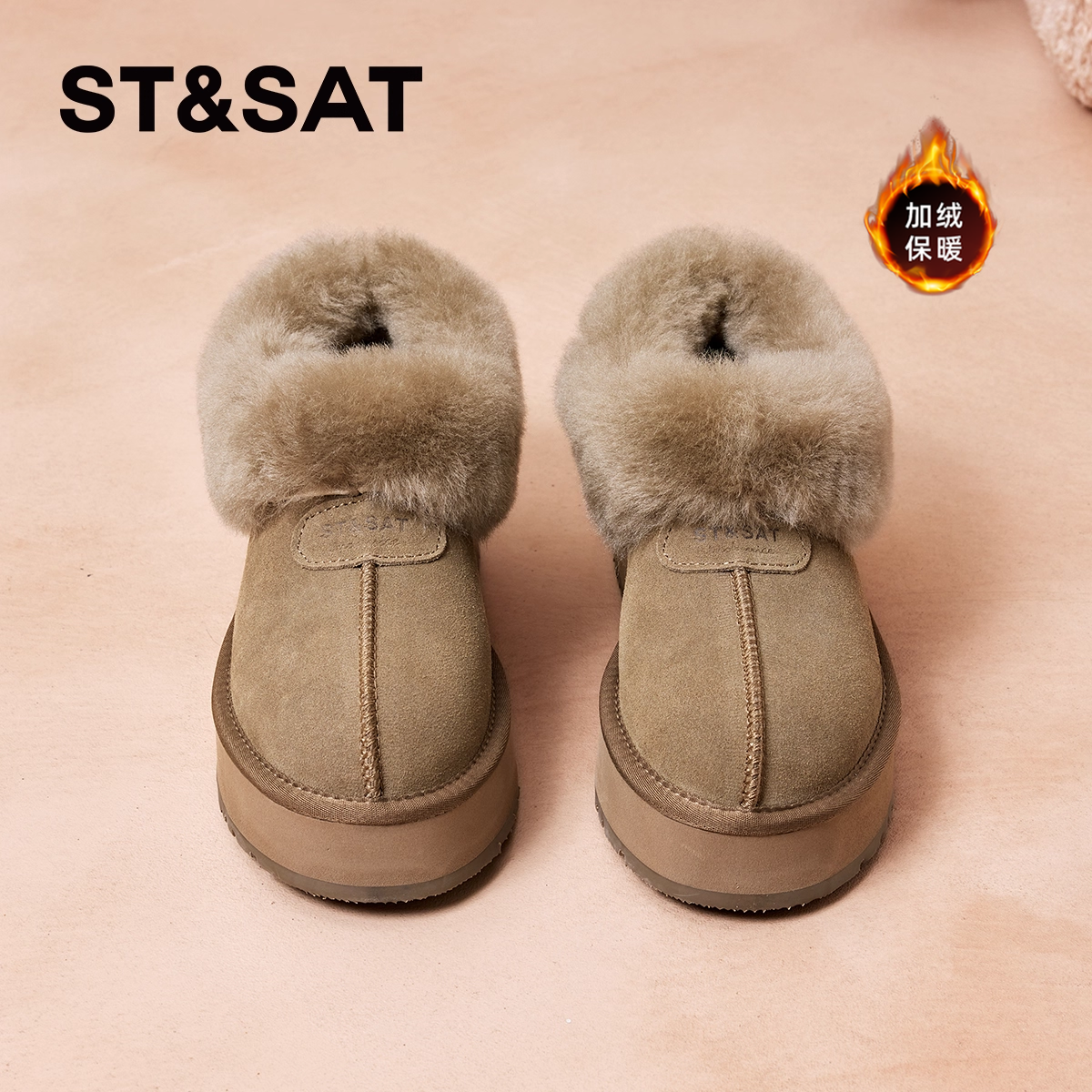 星期六2025冬季新款毛绒翻边雪地靴女加绒保暖厚底短靴冬季女靴