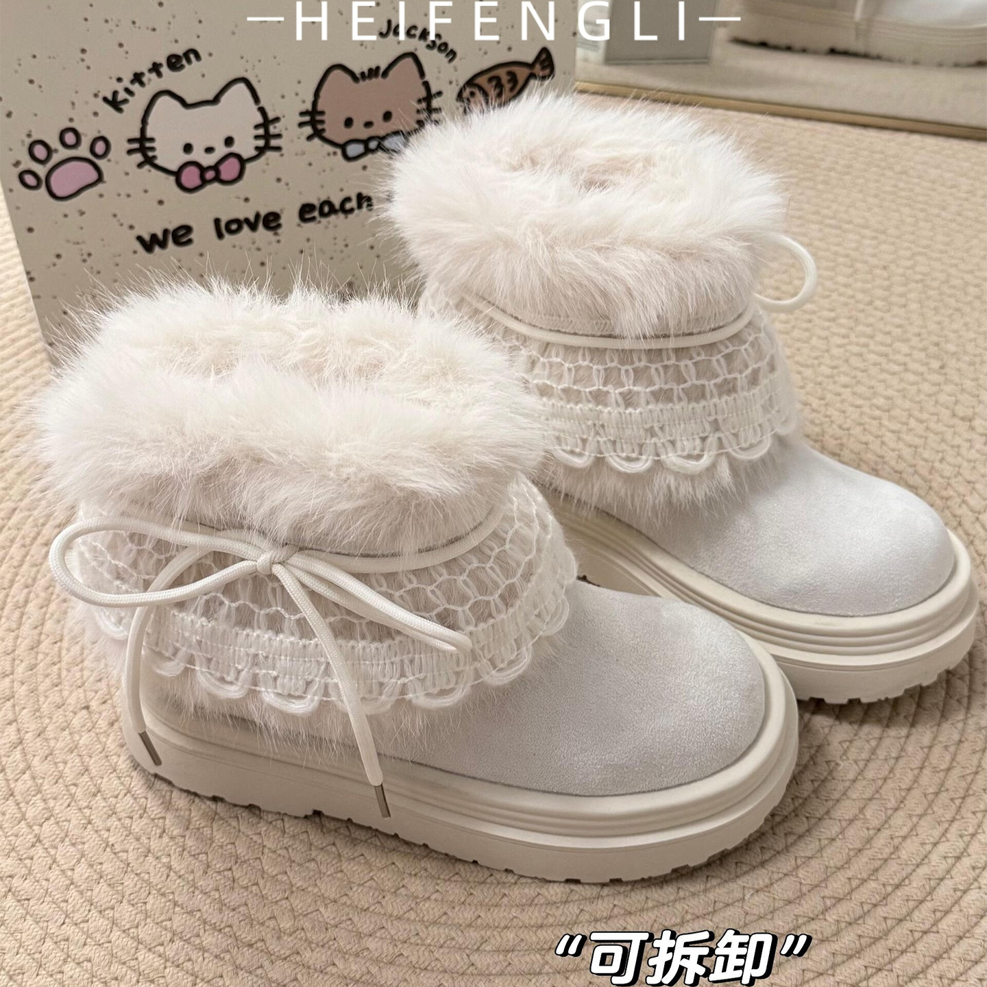 加绒保暖费尔曼靴毛毛鞋棉鞋厚底短靴冬季可拆卸两穿白色雪地靴女