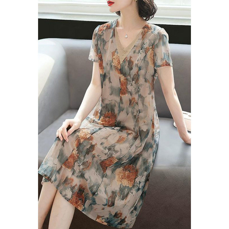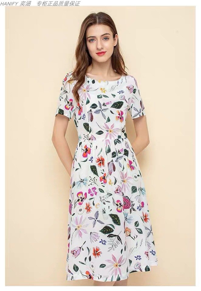 正品100%真丝桑蚕丝薄夏女田园花收腰H型中长连衣裙加大妈妈上衣