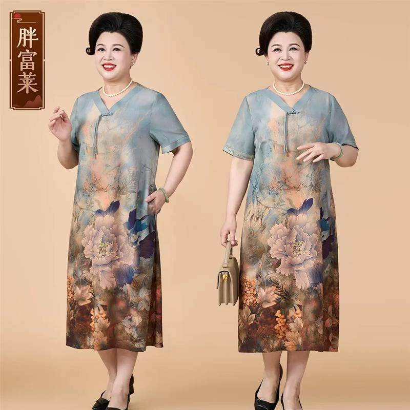 加肥加大妈妈夏装新款桑蚕丝立领洋气连衣裙宽松遮肉200斤垂感好