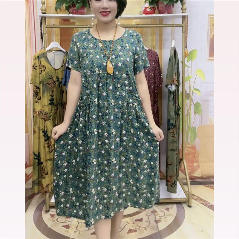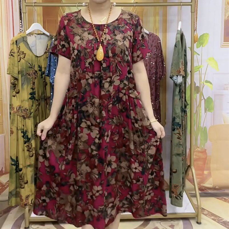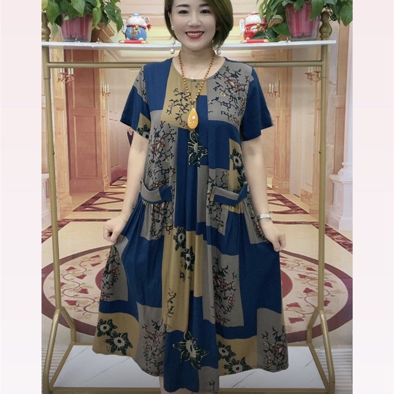 加肥加大妈妈夏天棉绸连衣裙中老年女装宽松显瘦短袖花色休闲裙子