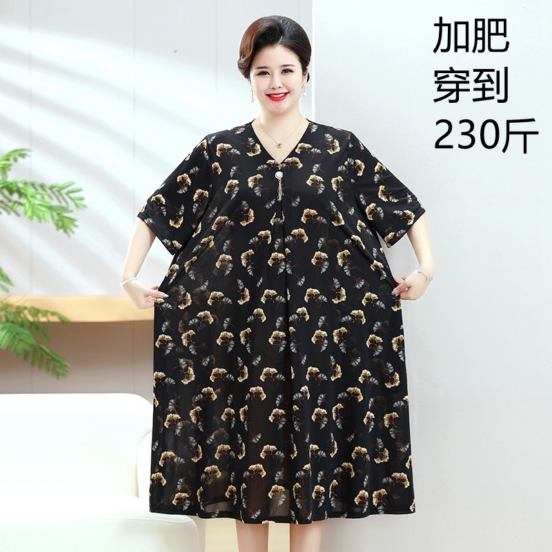 加肥加大妈妈装短袖雪纺连衣裙中老年女装200斤特超大码宽松裙子