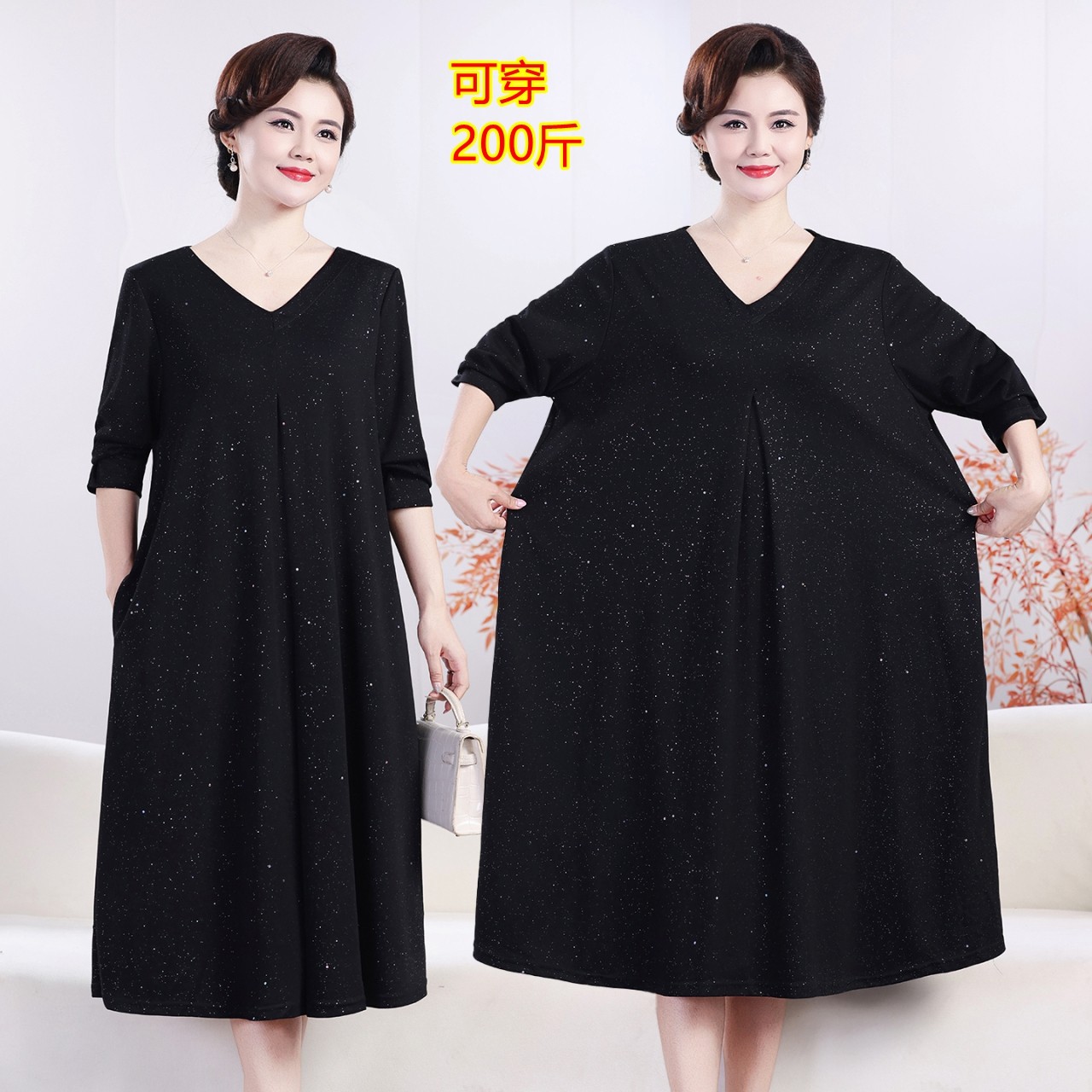 特大码200斤胖妈妈长袖连衣裙时尚洋气中年女士早秋宽松遮肚裙子