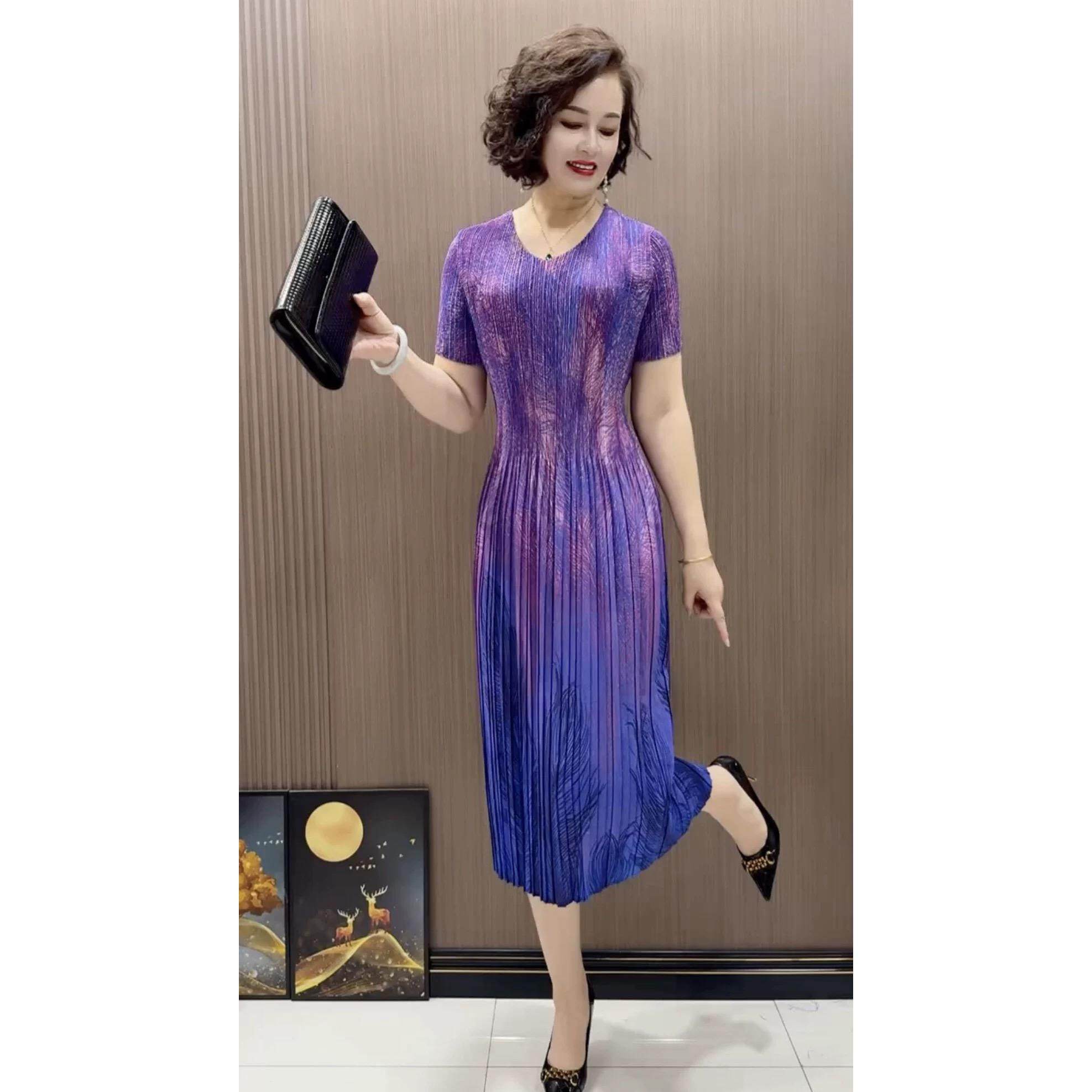 中年妈妈夏季渐变印花短袖连衣裙褶皱弹力宽松大妈遮肉显瘦过膝裙