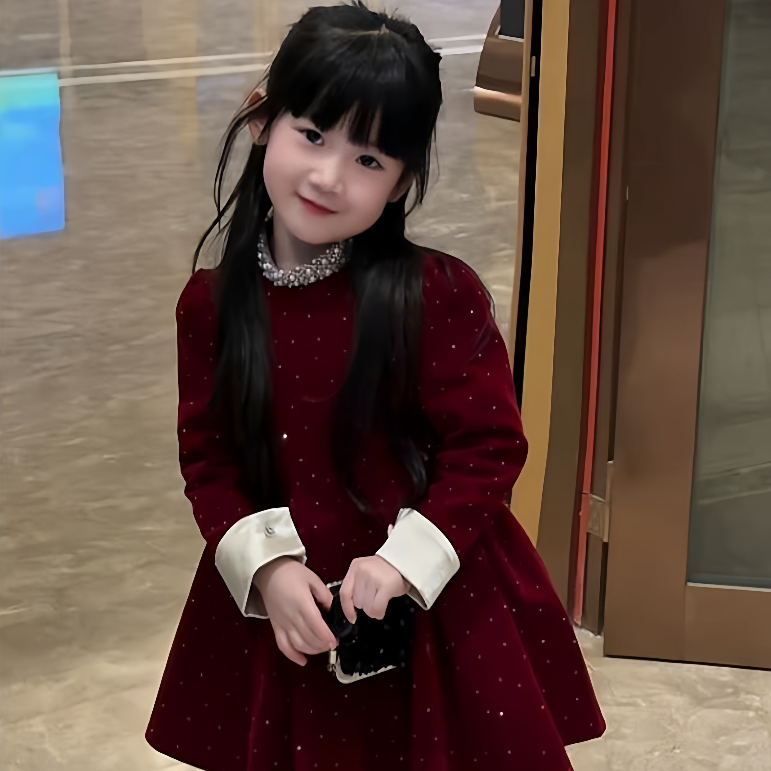 2026新款女童加绒连衣裙珍珠立领丝绒蓬蓬裙小女孩宴会红色裙气质