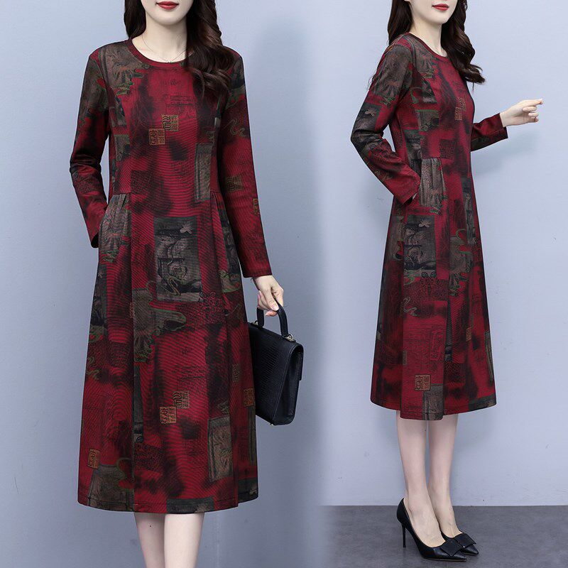 端庄大气中年妈妈长袖连衣裙2025秋季新款女装大妈红色减龄气质裙