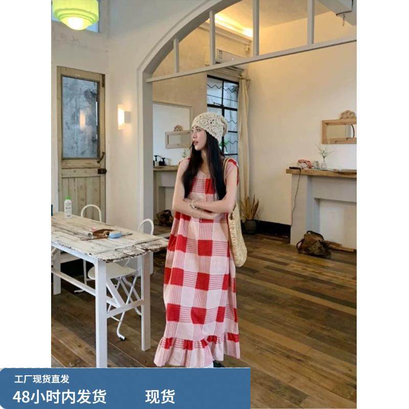 大妈300斤文艺撞色格子连身裙女胖MM2025新款时尚宽松背心长裙子2