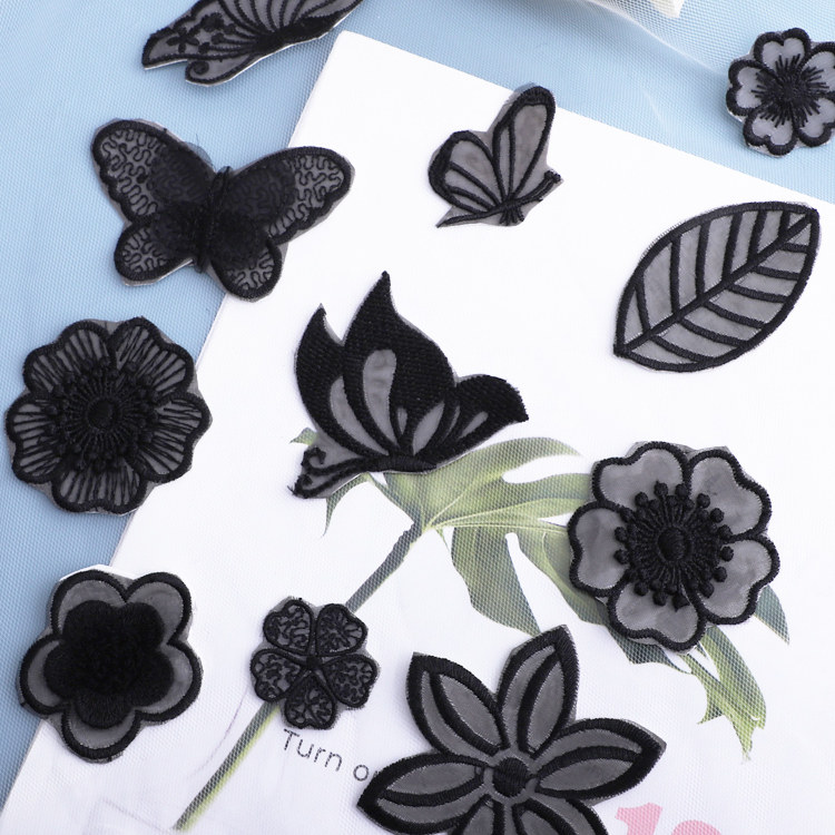 自粘黑色蕾丝布贴补丁贴刺绣贴花欧根纱免缝羽绒补洞装饰百搭蚊帐