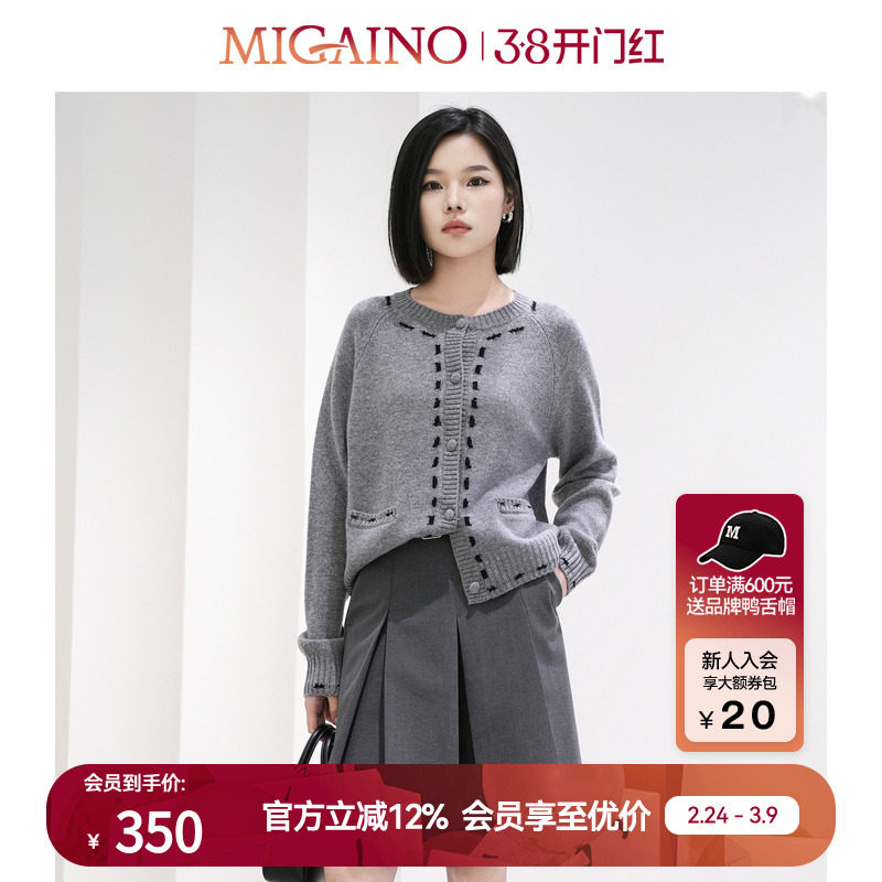 Migaino曼娅奴女装冬季新款圆领百搭宽松简约羊毛针织开衫外套