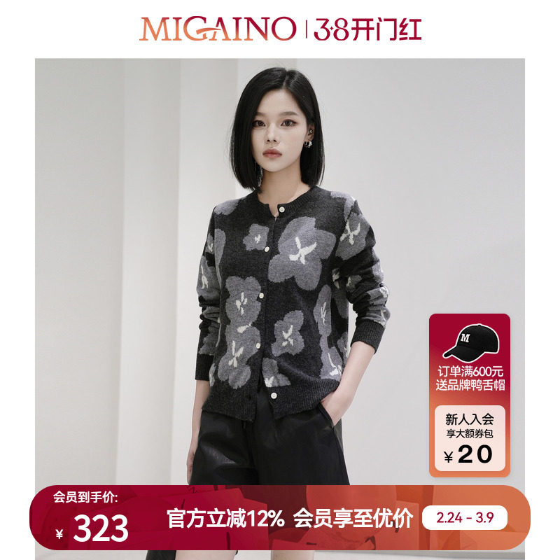 Migaino曼娅奴女装春秋新款优雅减龄羊毛提花针织长袖开衫外套