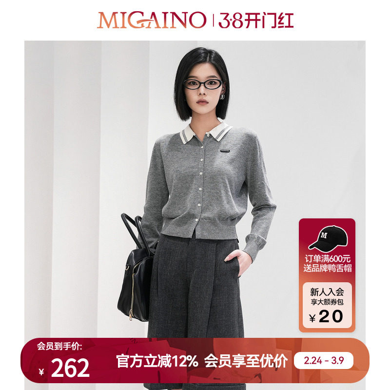 Migaino曼娅奴女装春秋新款学院风翻领减龄百搭针织开衫羊毛上衣