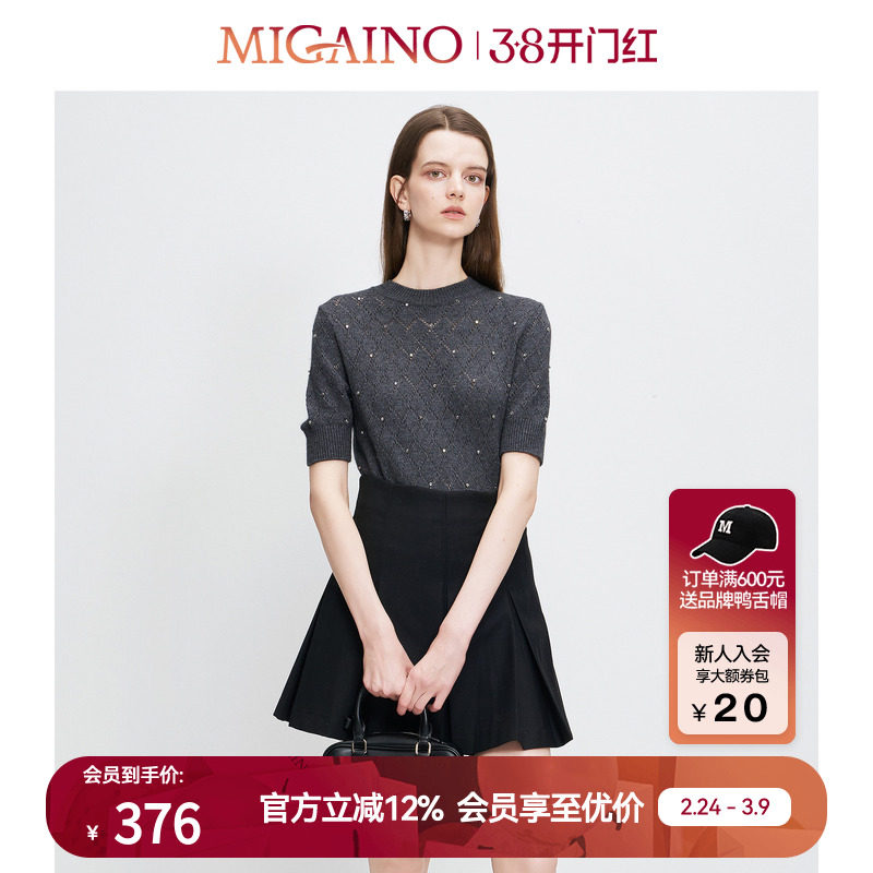 Migaino曼娅奴女装秋季新款时尚感圆领百搭贴钻短袖套头针织衫