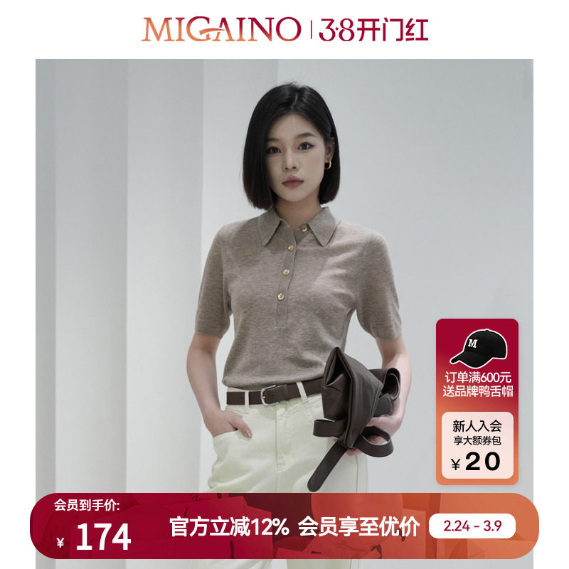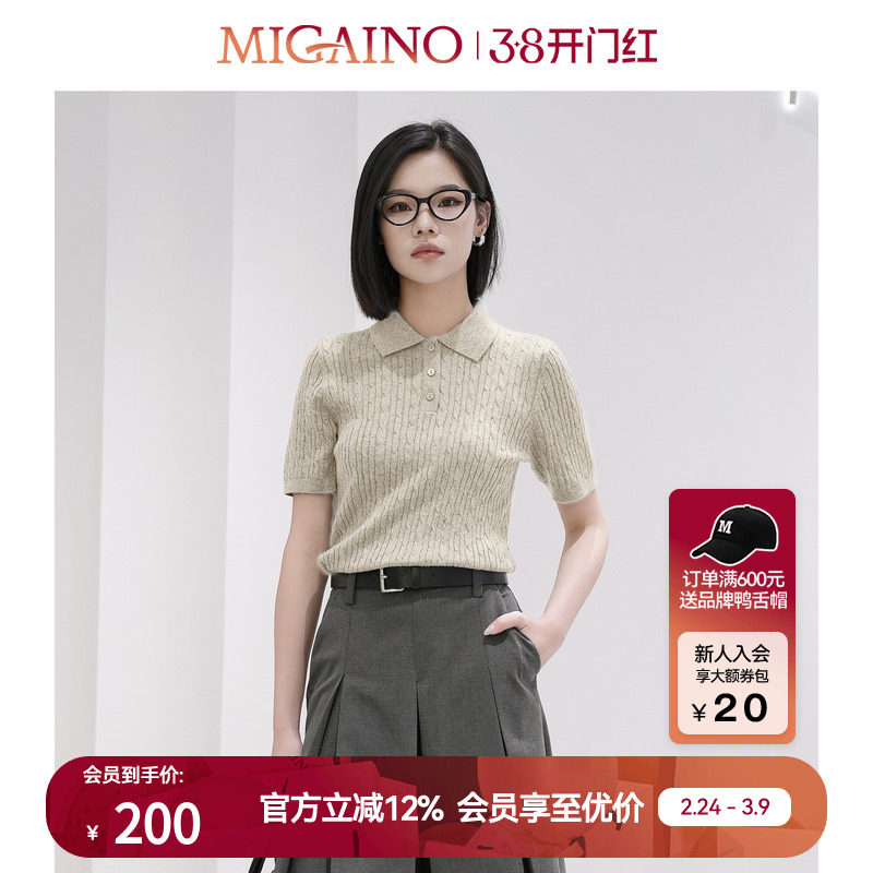 Migaino曼娅奴女装秋季新款polo领休闲百搭设计感绞花短袖针织衫