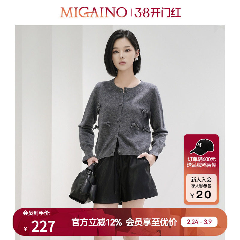 Migaino曼娅奴女装秋冬新款灰色圆领宽松蝴蝶结减龄针织开衫外套