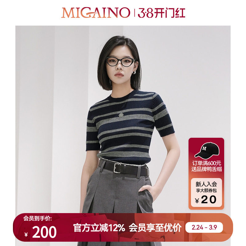 Migaino曼娅奴女装秋季新款设计感拼接条纹修身显瘦短袖针织衫