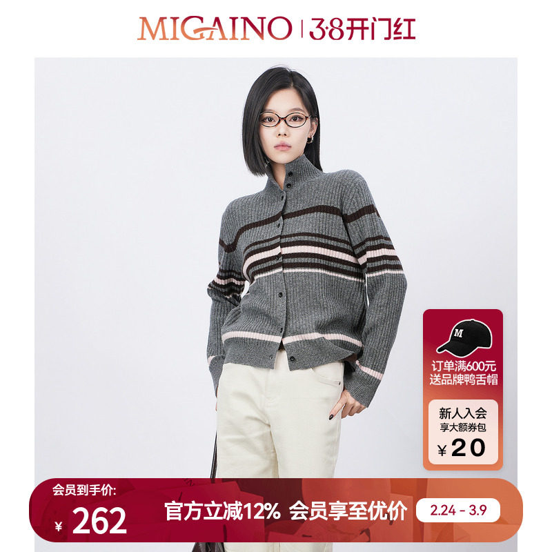 Migaino曼娅奴女装秋季新款圆领条纹软糯针织开衫MO32JK209