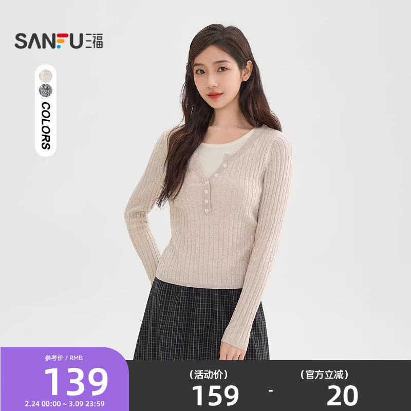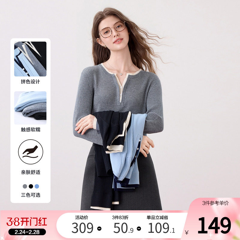三福套头毛衣女2026新款春季撞色假两件圆领针织衫上衣女装516745