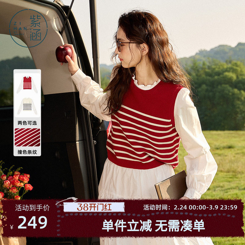紫涵假两件撞色条纹针织马甲女春秋季新款甜美木耳领套头针织衫潮
