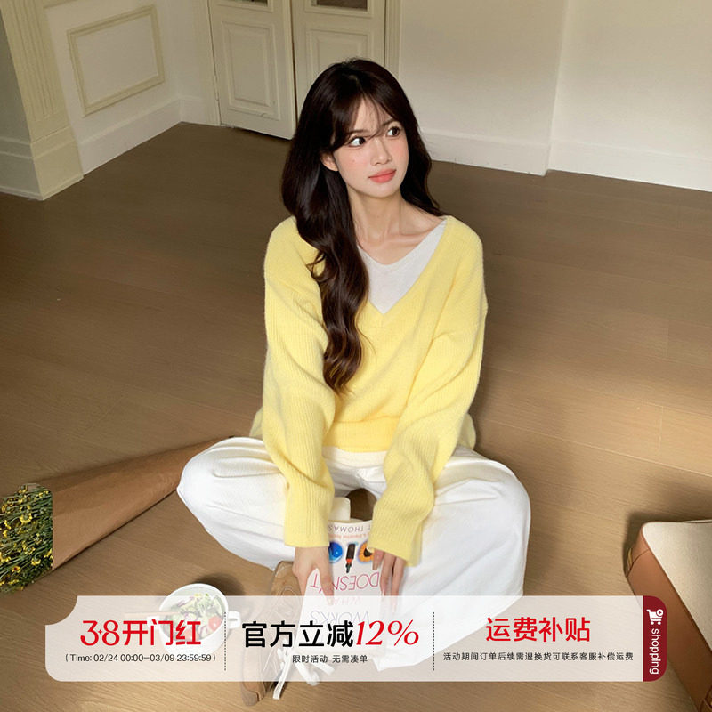 荒荒家 假两件V领毛衣外套2025冬季新款小众软糯设计套头针织衫女