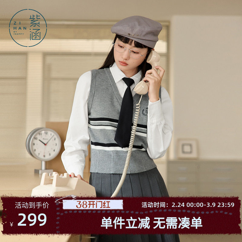 紫涵学院风假两件针织衫女春秋季新款短款修身显瘦套头翻领上衣潮