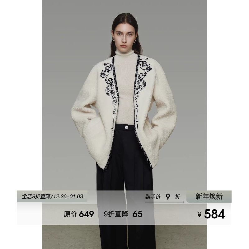 圣迪家女士毛呢大衣秋冬款刺绣图案袖袢开衩设计含羊毛71%1871