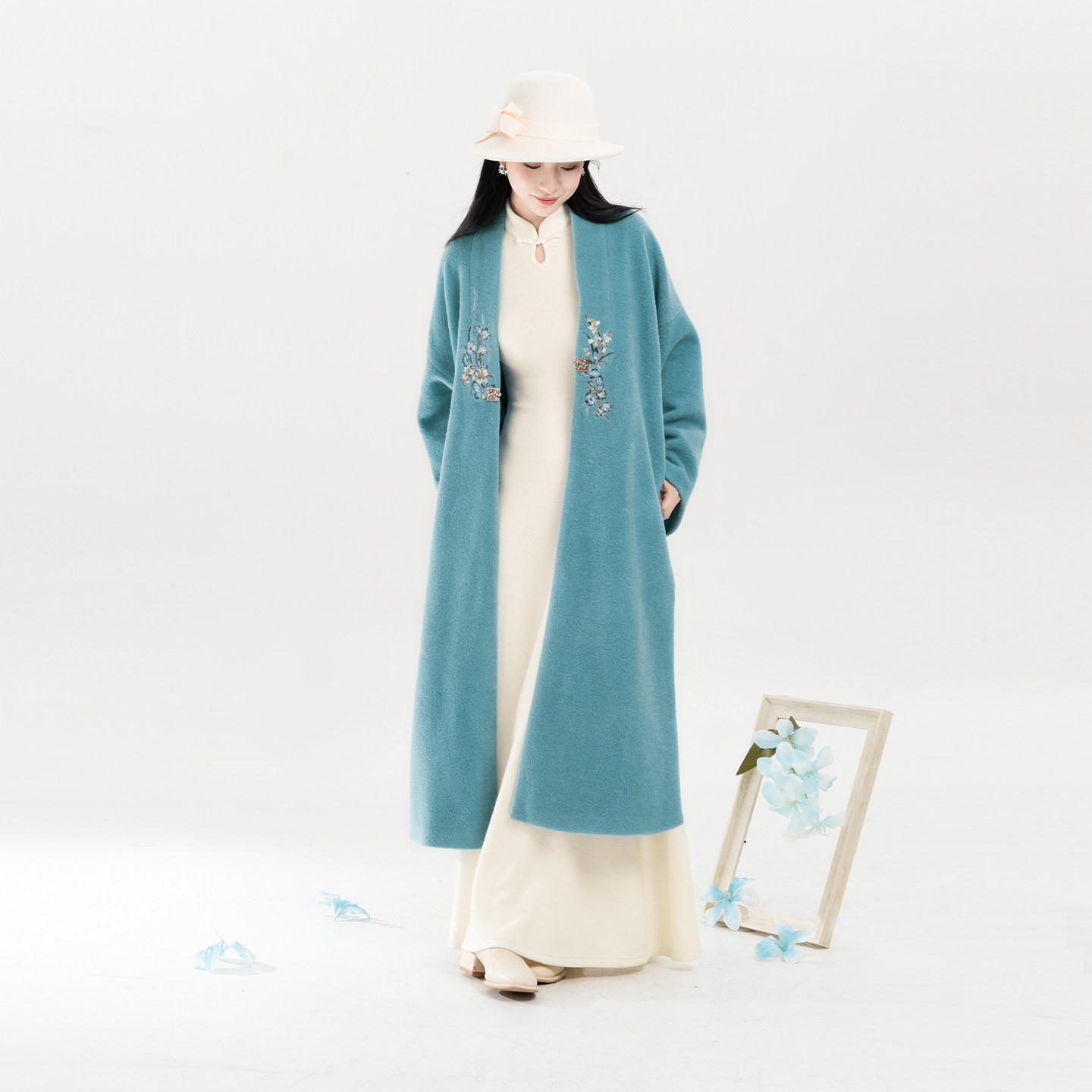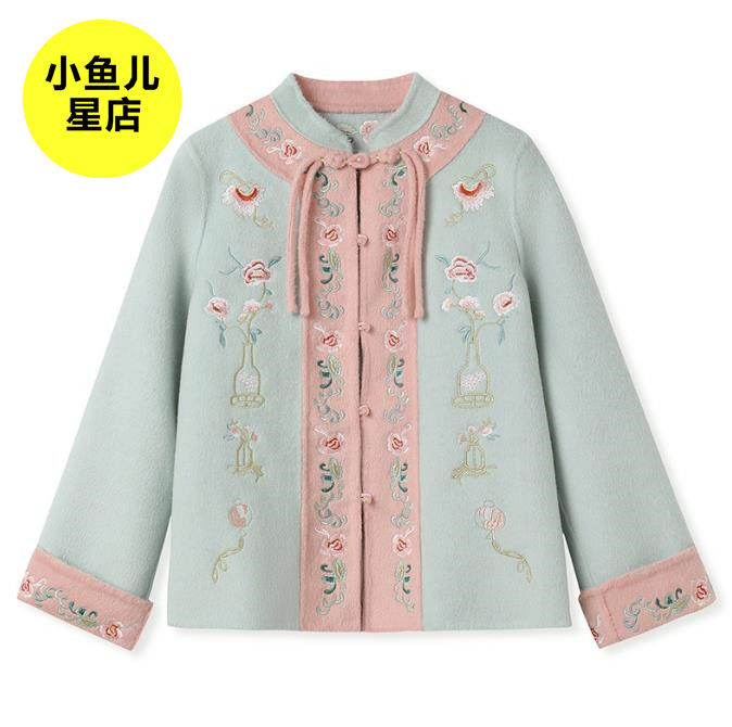 织造司[湖心雪]汉元素刺绣明对襟毛呢大衣外套小立领长袖连衣裙女