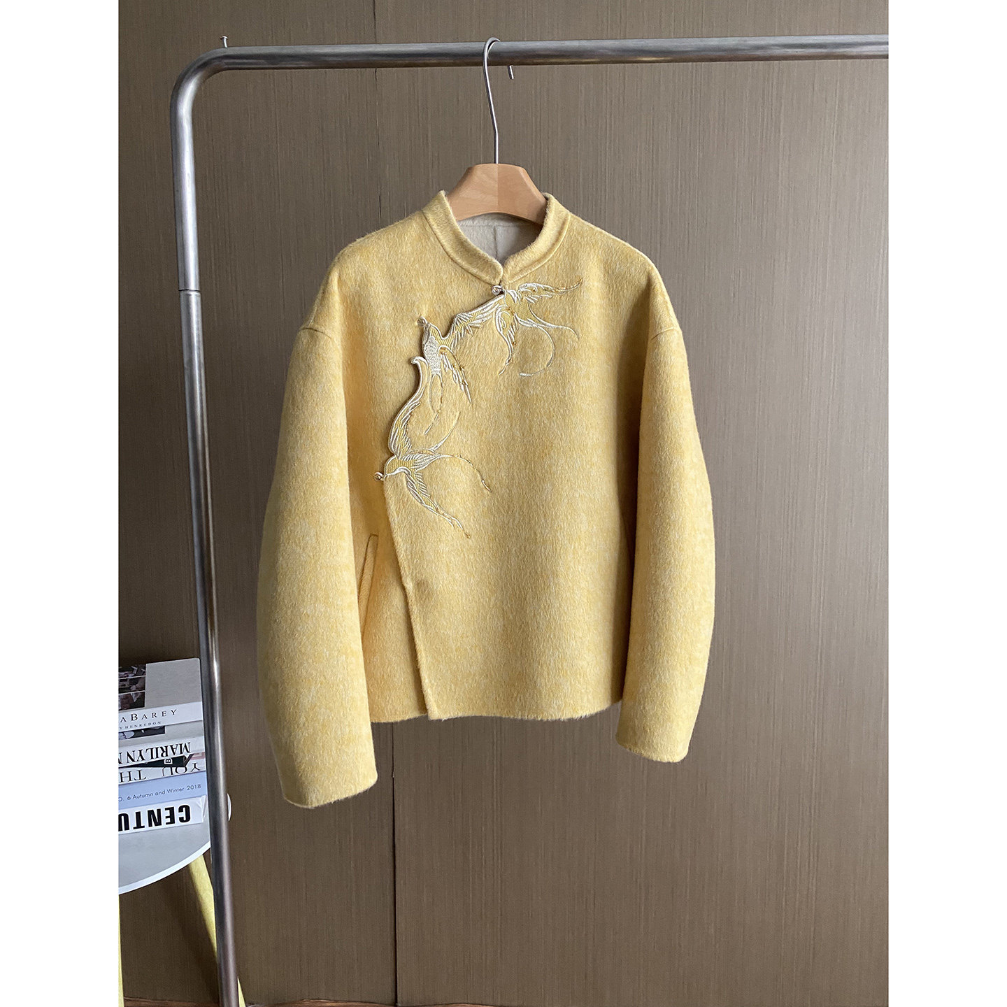 中国风立领斜襟刺绣羊毛双面呢外套女短款黄色毛呢外套钉珠短大衣