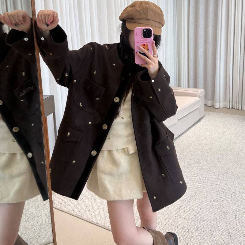 谜底羊毛呢大衣女2023冬新款学院风设计感绣花宽松外套234MD1527