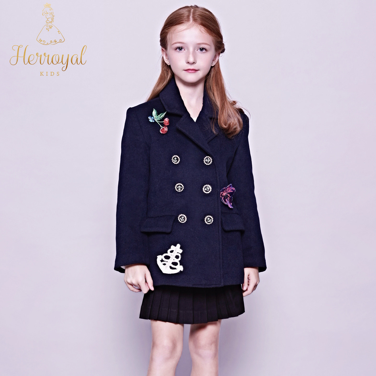 HERROYAL刺绣学院风女童羊毛外套大衣毛呢加厚冬装大童气质款亲子