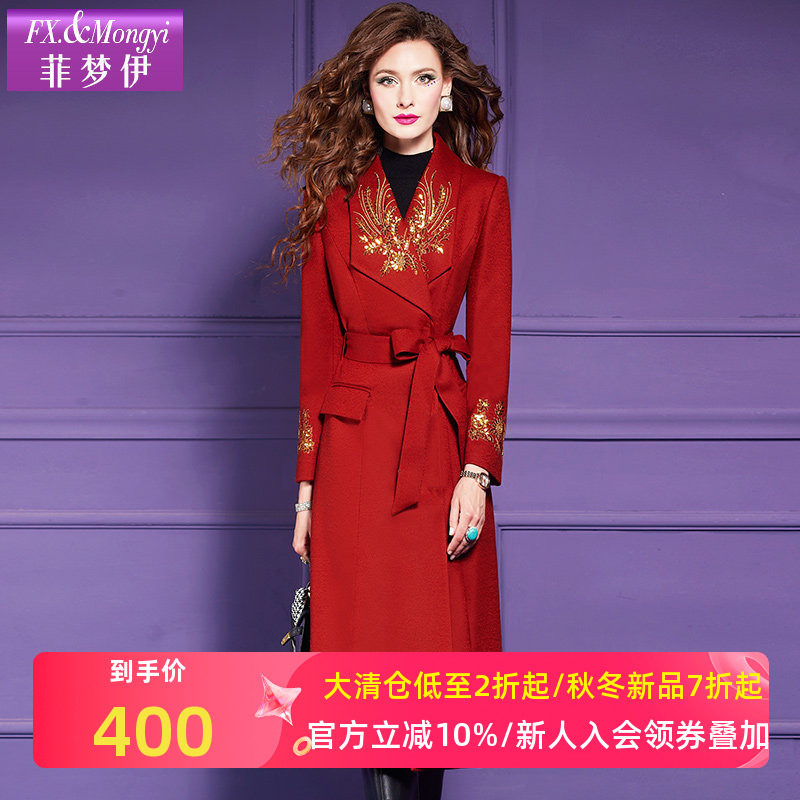 菲梦伊含羊毛绣花红色毛呢外套女冬季立领加厚收腰中长款呢子大衣