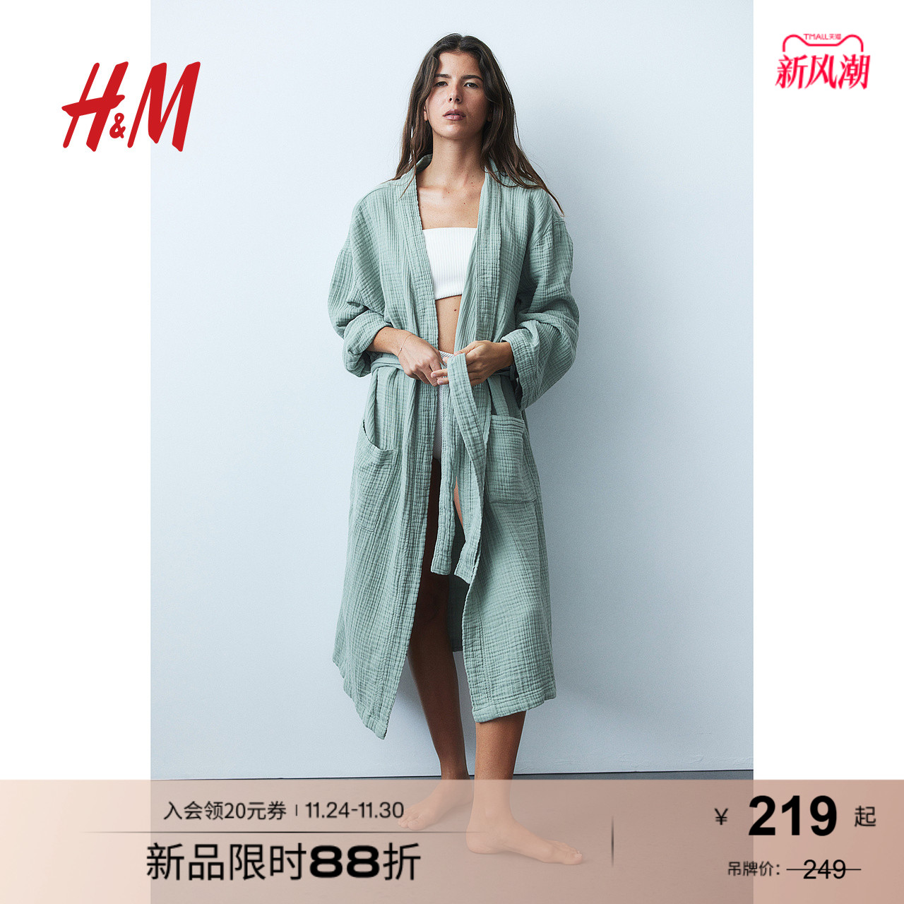HM女士内衣睡袍秋季舒适简约时尚系带细棉布睡袍1206055