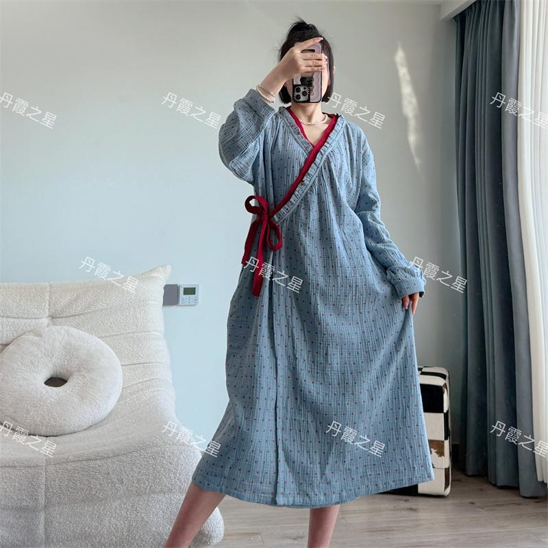 色织纯棉纱布睡袍女士春秋季全棉薄款宽松汗蒸和服浴袍家居服睡衣